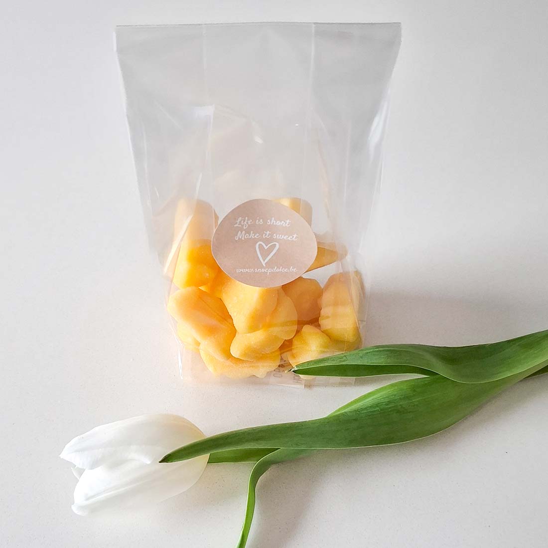 Ingrediënten: fondant 45% (suiker, glucosestroop, water), suiker, water, glucosestroop, glucose-fructosestroop, glycerine E422, kleurstoffen (E120, E160a(i), E160b(ii), E172), aroma, zonnebloemolie, kippenEI-eiwit, citroensap, emulgator E473.